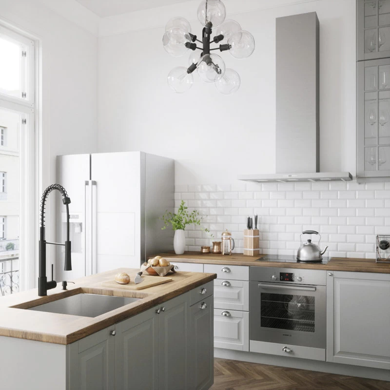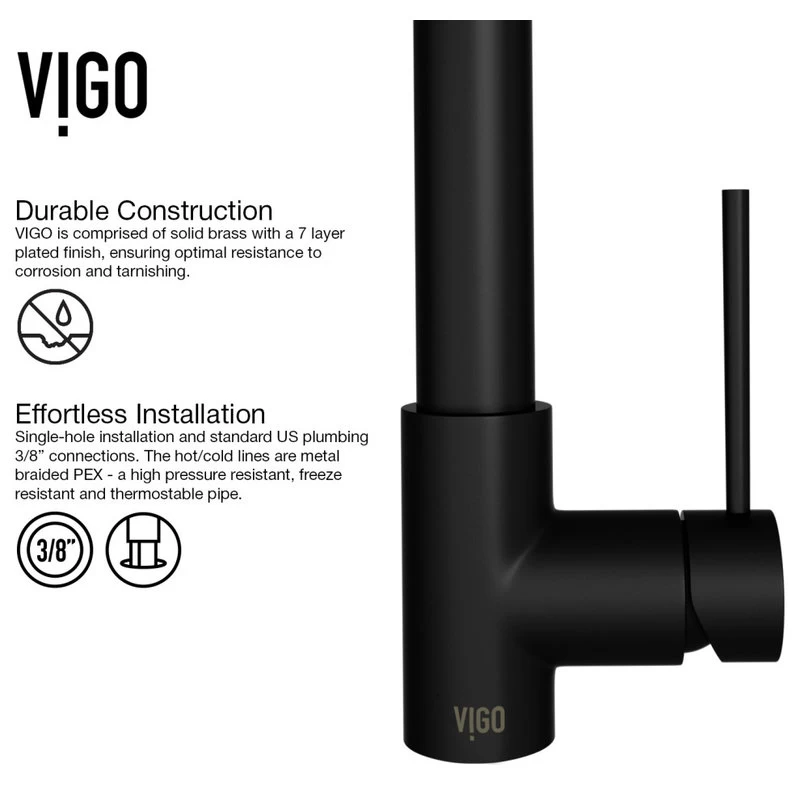 VIGO presents the Laurelton pull-down spray kitchen faucet. Its tall spout and 22-inch hose make using it easier than ever. The faucet features a single lever that controls water and temperature, making it accessible to everyone. A premium 7-layered finish helps the hardware resist wear and tear. The 1.8 GPM flow rate conserves water, and the nozzle resists mineral buildup, making the faucet easy to clean. Thanks to its single-hole mount and standard US plumbing 3/8 inch connections, installation is a breeze. The VIGO Laurelton is just what you need to upgrade your kitchen workstation instantly.