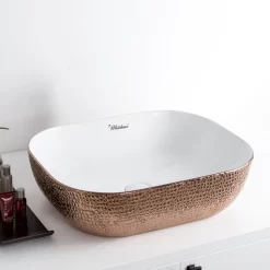 Whitehaus Collection exceeds expectations with the exquisite additions offered in our Isabella Plus Collection. Combining both beauty and durability, these above mount sinks are crafted from the highest quality vitreous china available. The fine craftsmanship shines through with its luxurious, unique and bold seamless design. This rectangular above mount sink features an embossed, rose gold tone exterior and smooth solid white interior, has a center drain and no overflow. Let Whitehaus Collection help redefine your home with a new level of sophistication by enhancing your bathroom d cor with this elegant Isabella Plus above mount basin.