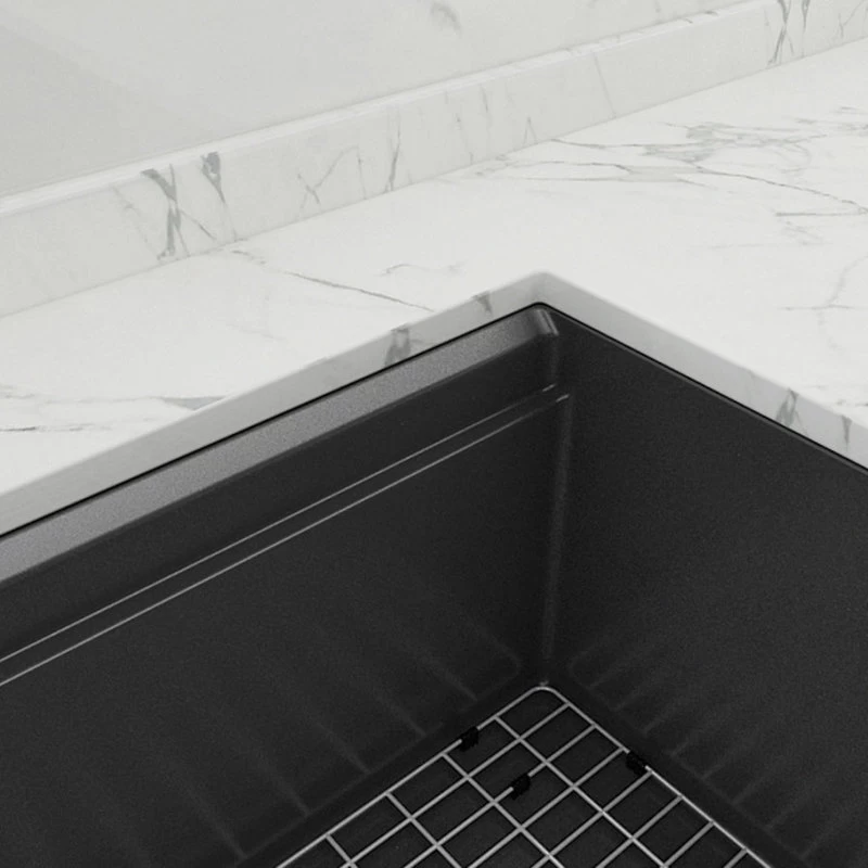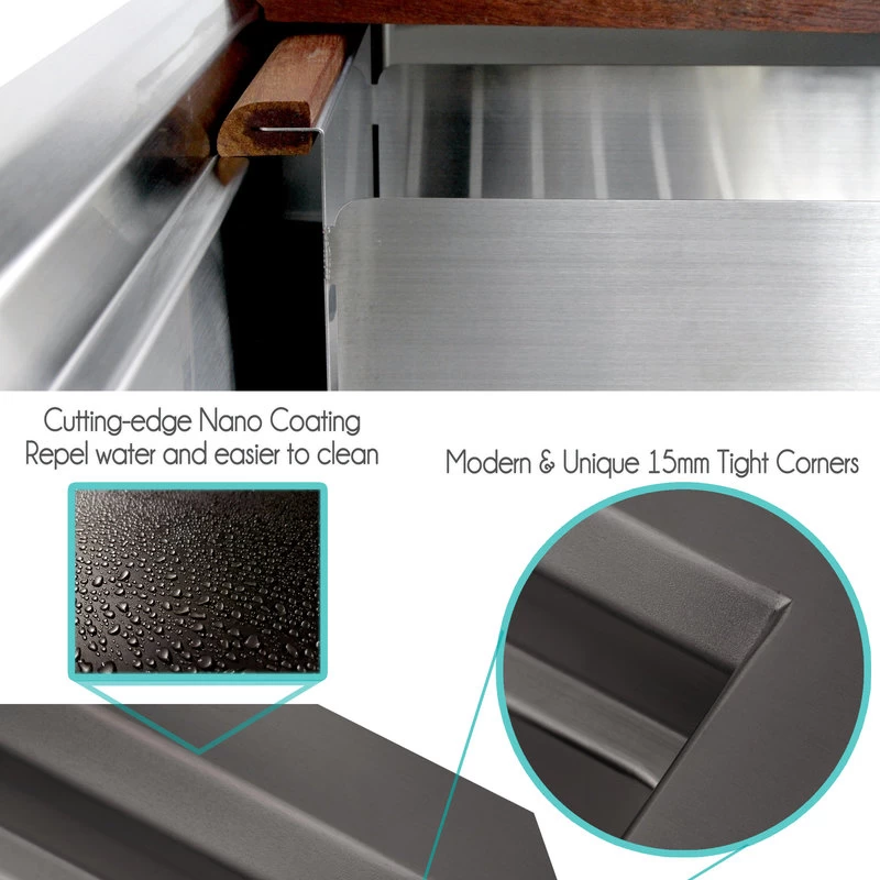 - Complete premium accessories package – silicone dish drying rack, walnut cutting-board, stainless steel colander, protective bottom grid, drain hole cover, lift-out basket strainer